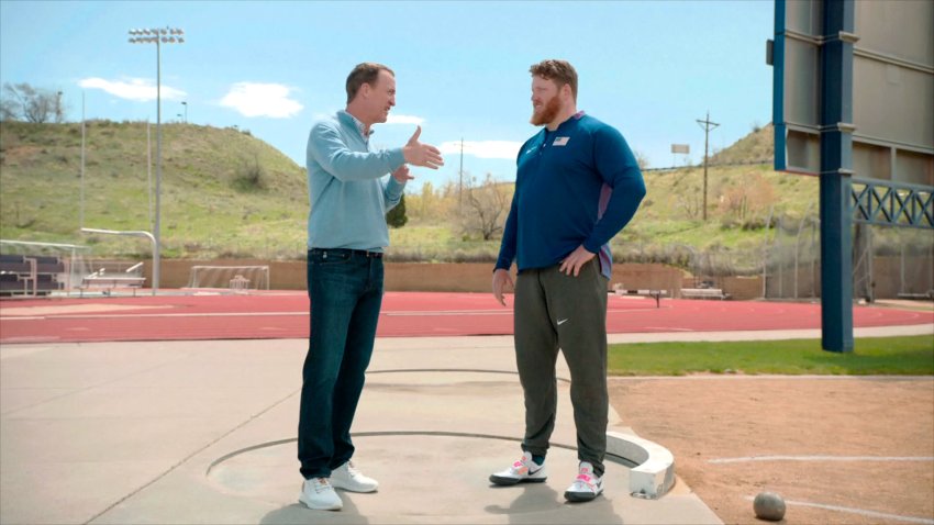 Peyton Manning interviews shotputter Ryan Crouser
